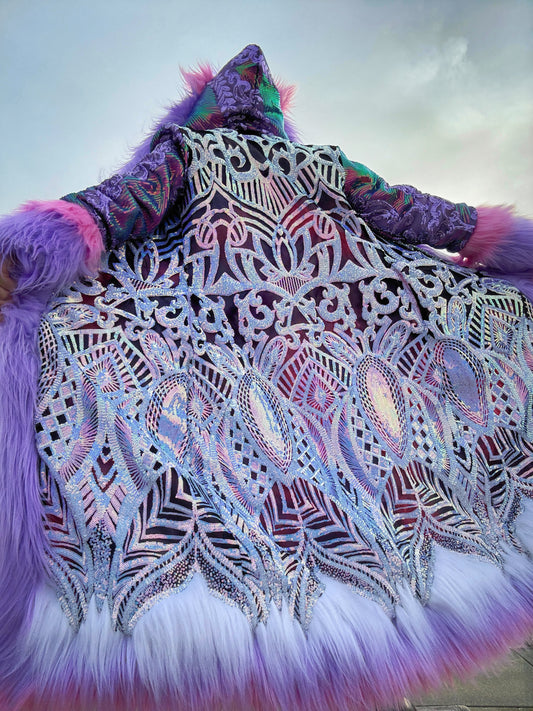 Custom Royalty Sequin Coat - Hooded, Reversible, Full Fur Trim w/ Patchwork Hem