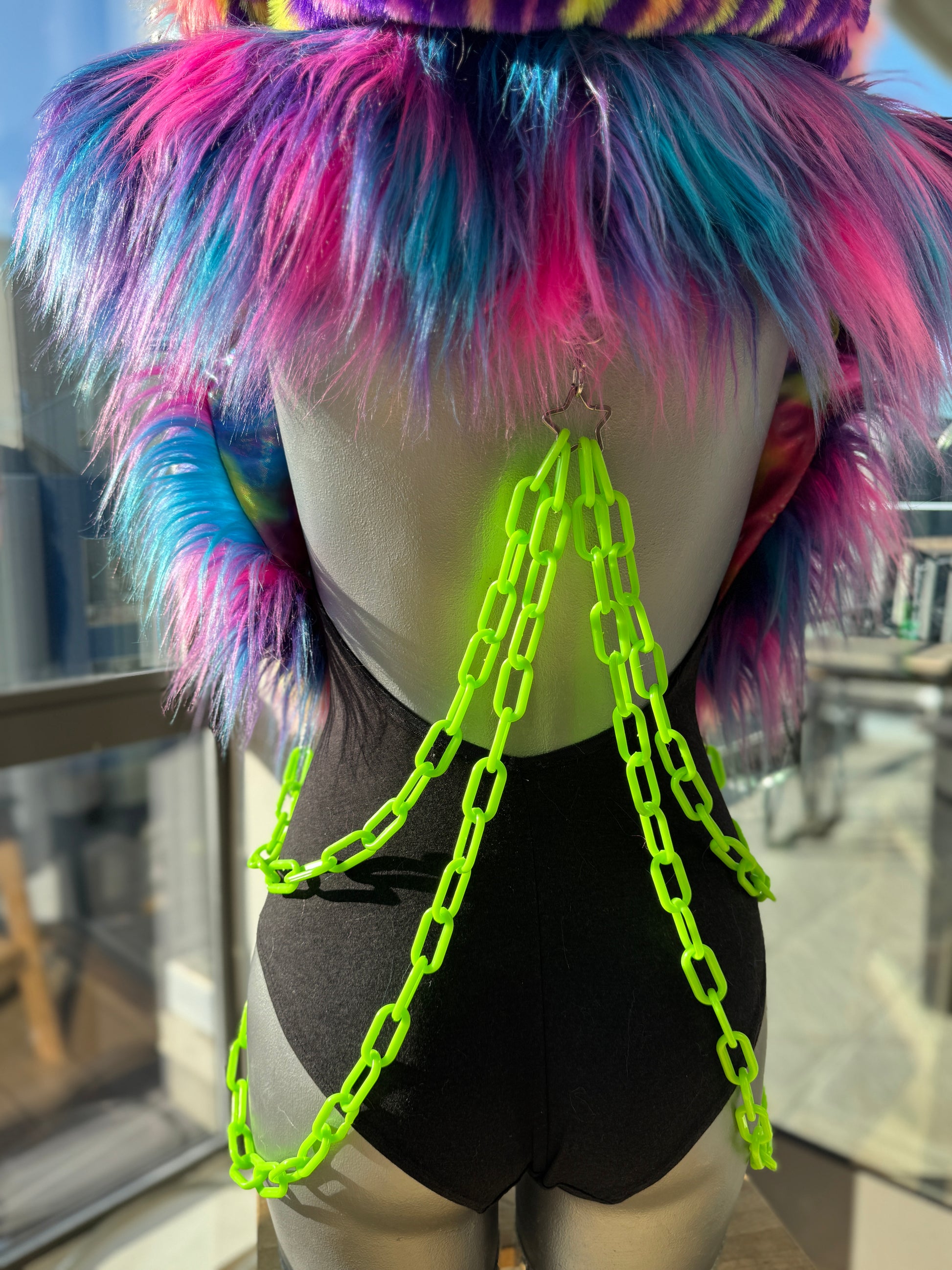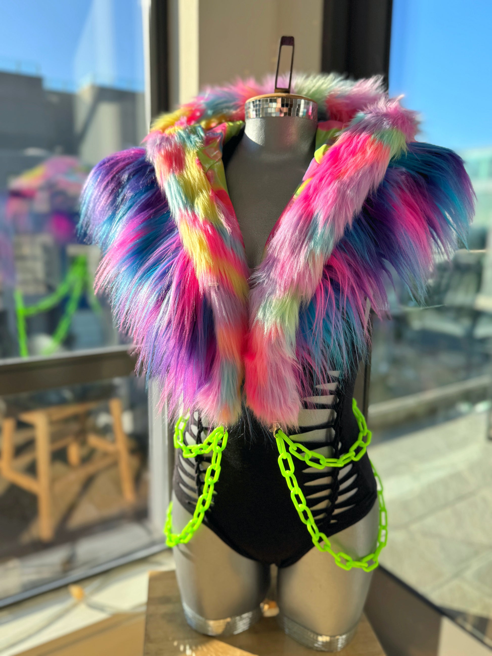 Long tri-tone neon fur of pink, blue, and purple on the body. Hood has a short rainbow cheetah fur. Front trim is pastel pink rainbow fur. Ears are baby pink with iridescent sequin liner. Hood liner is all rainbow spandex baby!