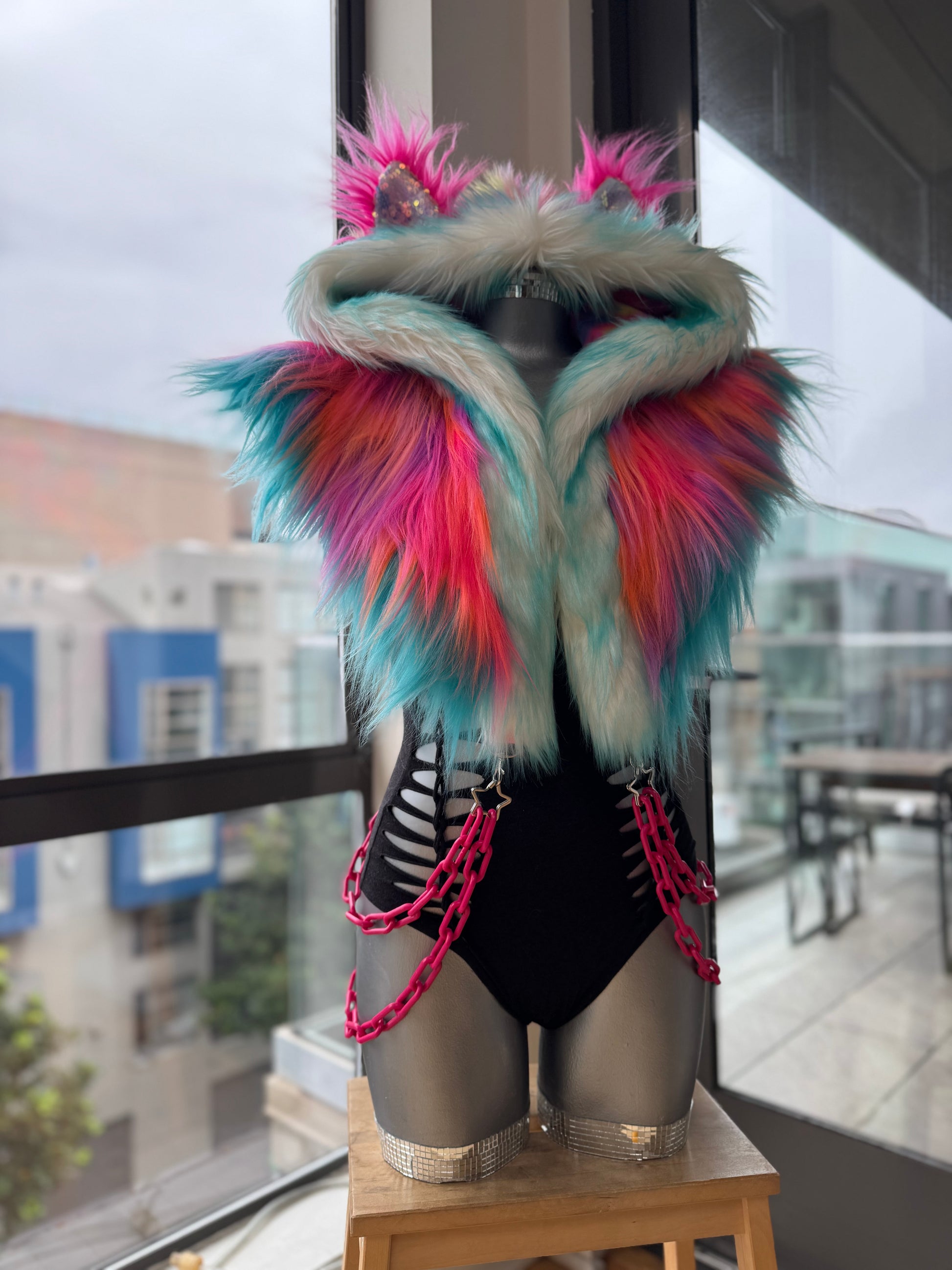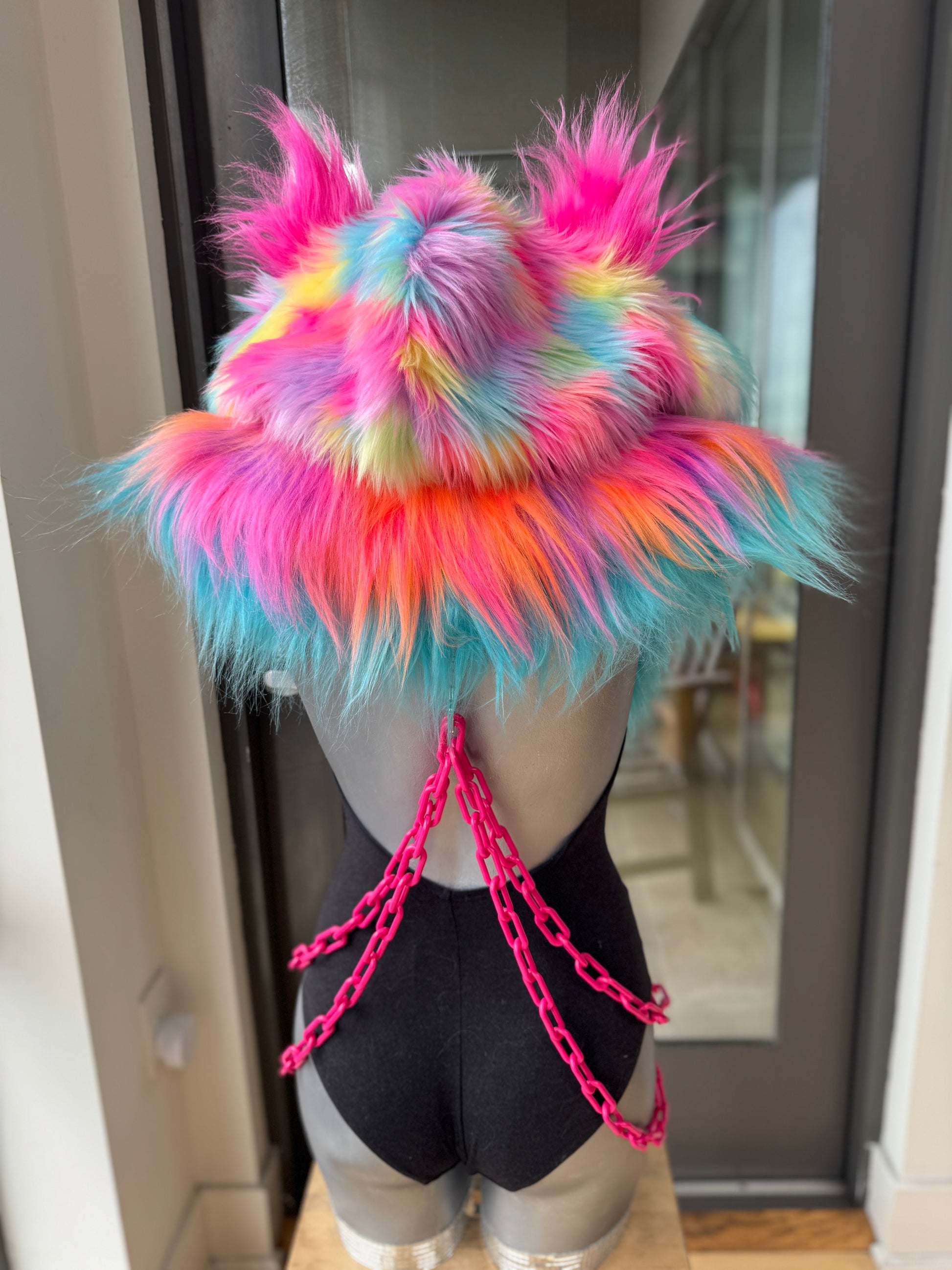 Long neon sunset pink + orange faux fur exterior with turquoise edge trim. Hood has pastel rainbow short fur with pink, blue, yellow, and more. Front trim is turquoise on white short fur. Ears are yellow on white fur with a pastel iridescent sequin liner. Hood liner is all rainbow spandex baby! Includes a thick silver metal chain.